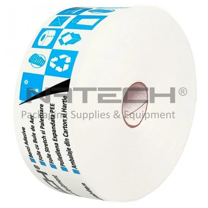 Banda Adeziva Umectibila Personalizata 60 mm x 200 m Lungime 200 m, Numar Culori 1 Culoare, Latime 60 mm, Adeziv Amidon, Tip Imprimare Pe Suprafata, Culoare Alb, Buc / Pachet 250