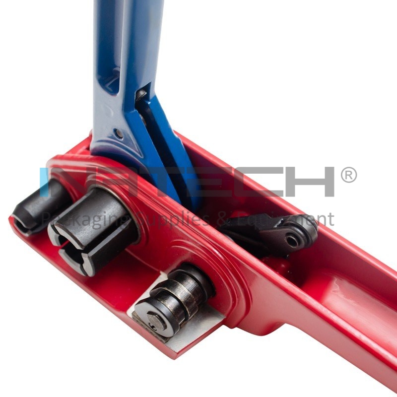 Dispozitivul permite legarea benzilor PES/PP cu ajutorul buclelor metalice, realizand tensionarea, dar si taierea benzii ramase.